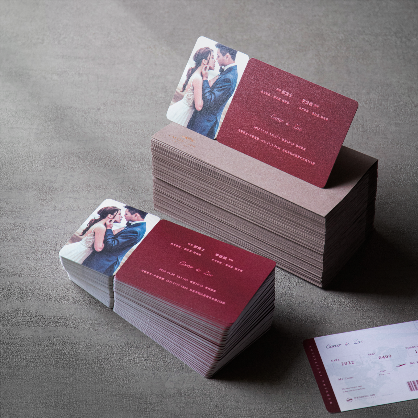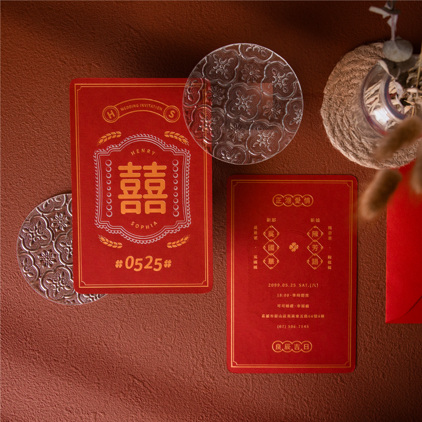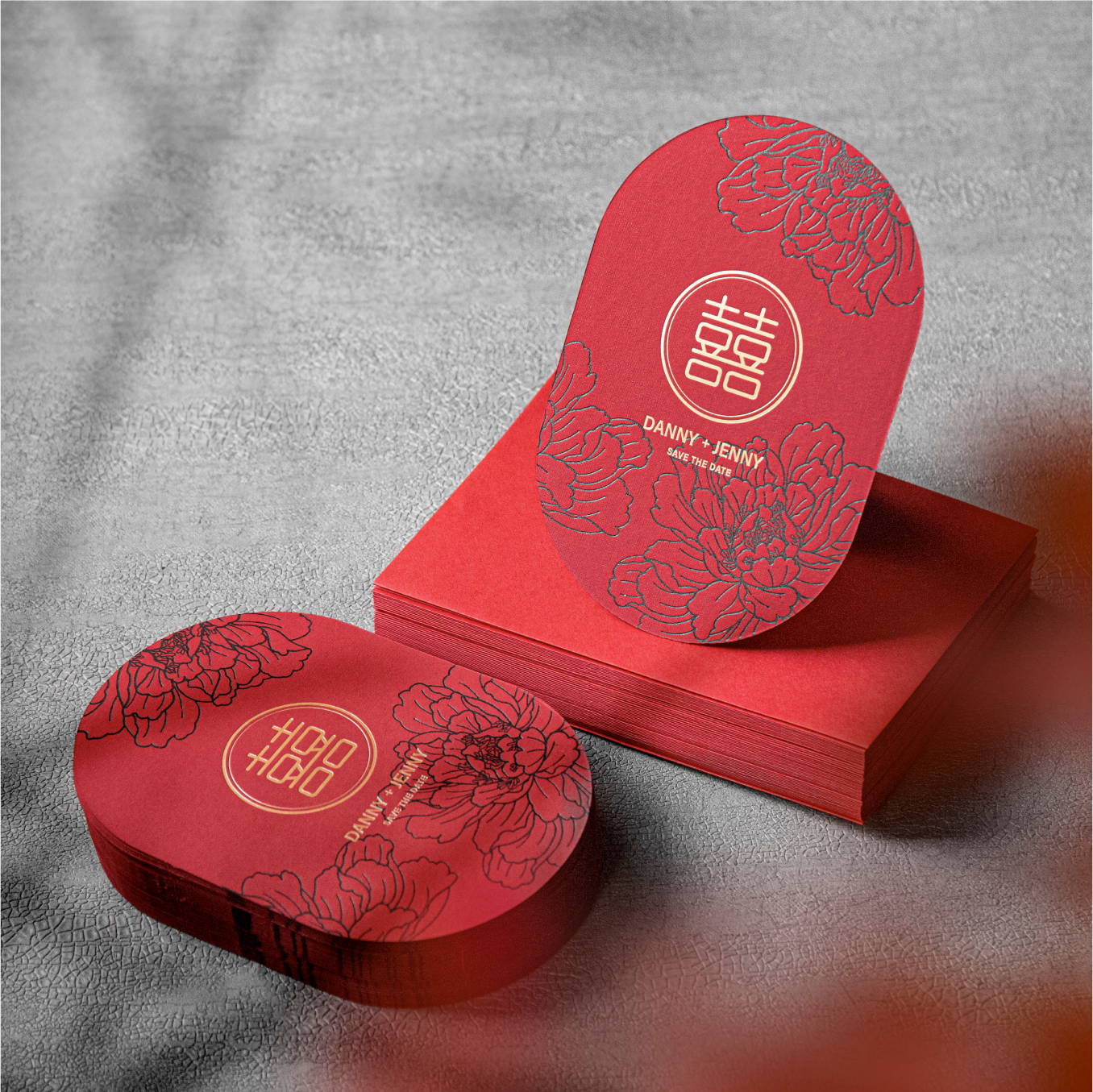 葡萄牙萊妮厚棉卡優雅的質感,為正紅色增添一份柔情,特別裁切成橢圓形狀,象徵圓滿的愛情;正面再結合打凹的芍藥花朵線條,將精緻推升至極致!正面的囍字與背面的婚禮資訊皆以燙香檳金處理,讓婚卡散發迷人高貴氣息!